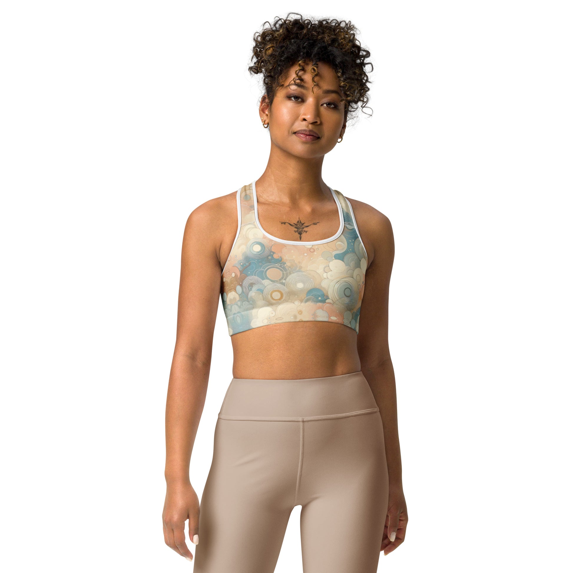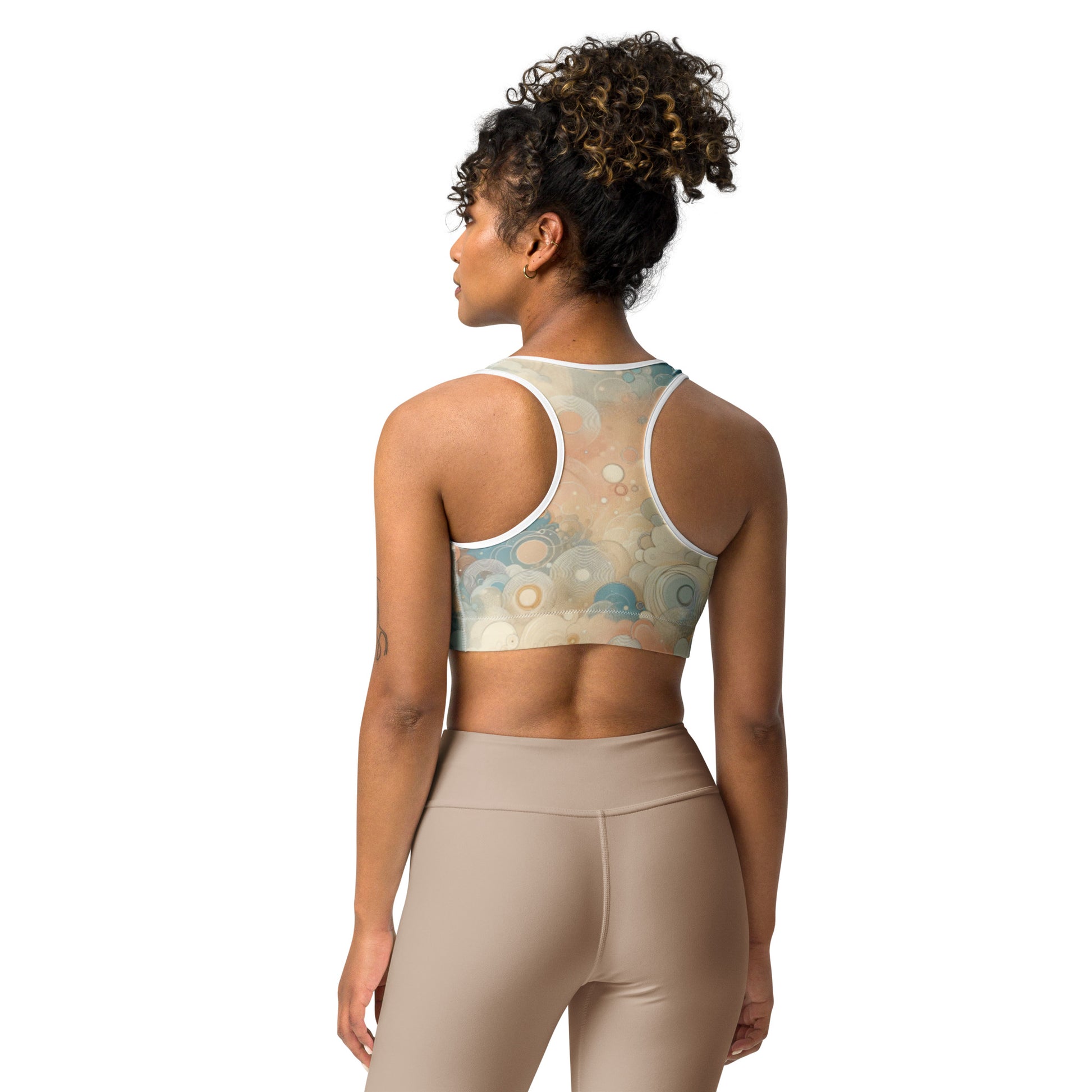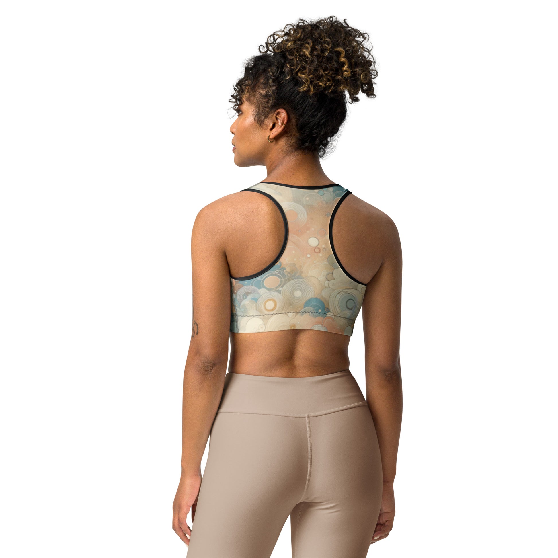This gorgeous sports bra is made from moisture-wicking material that stays dry during low and medium intensity workouts. The bra has support material in the shoulder straps, double layer front, and a wide elastic band to ensure constant support.
