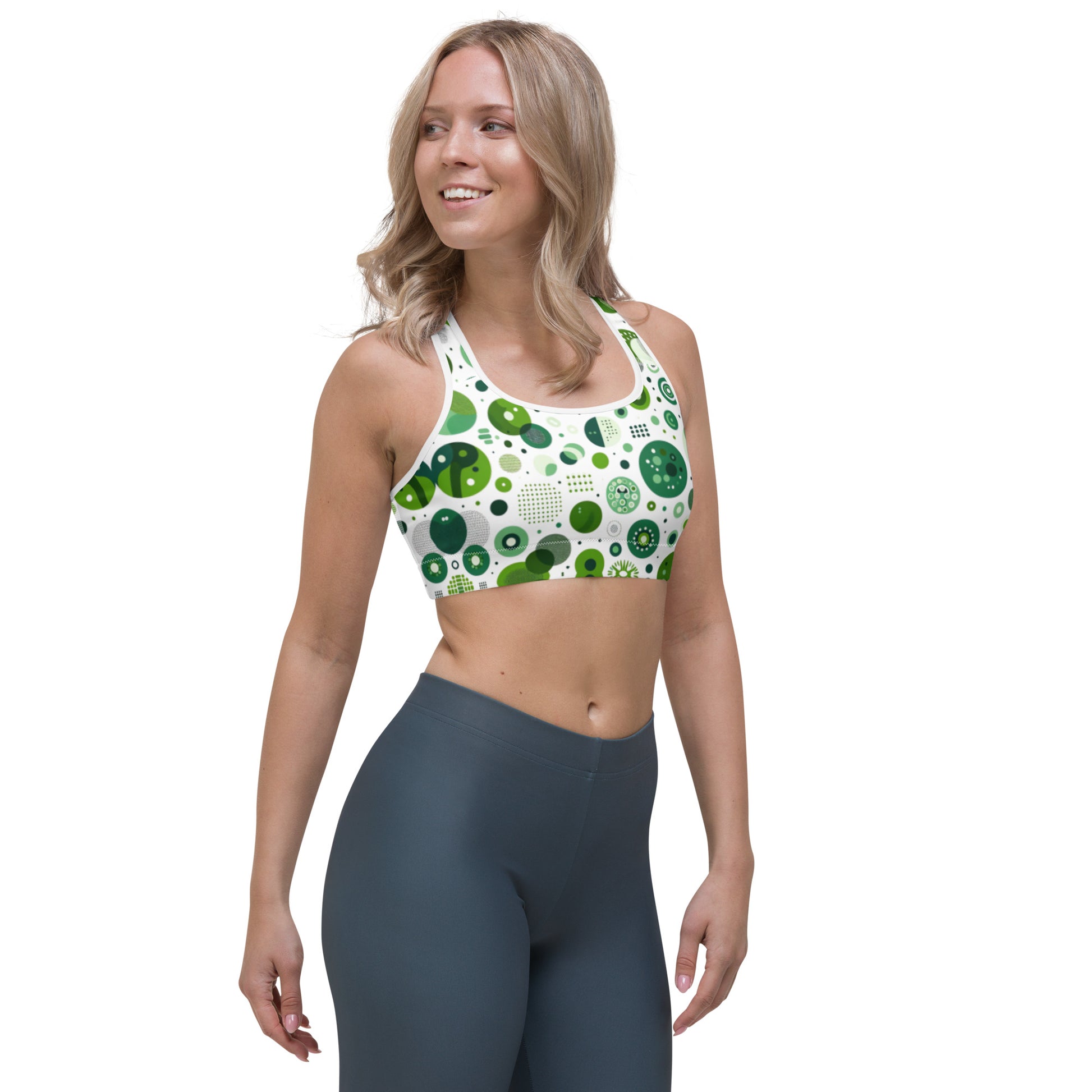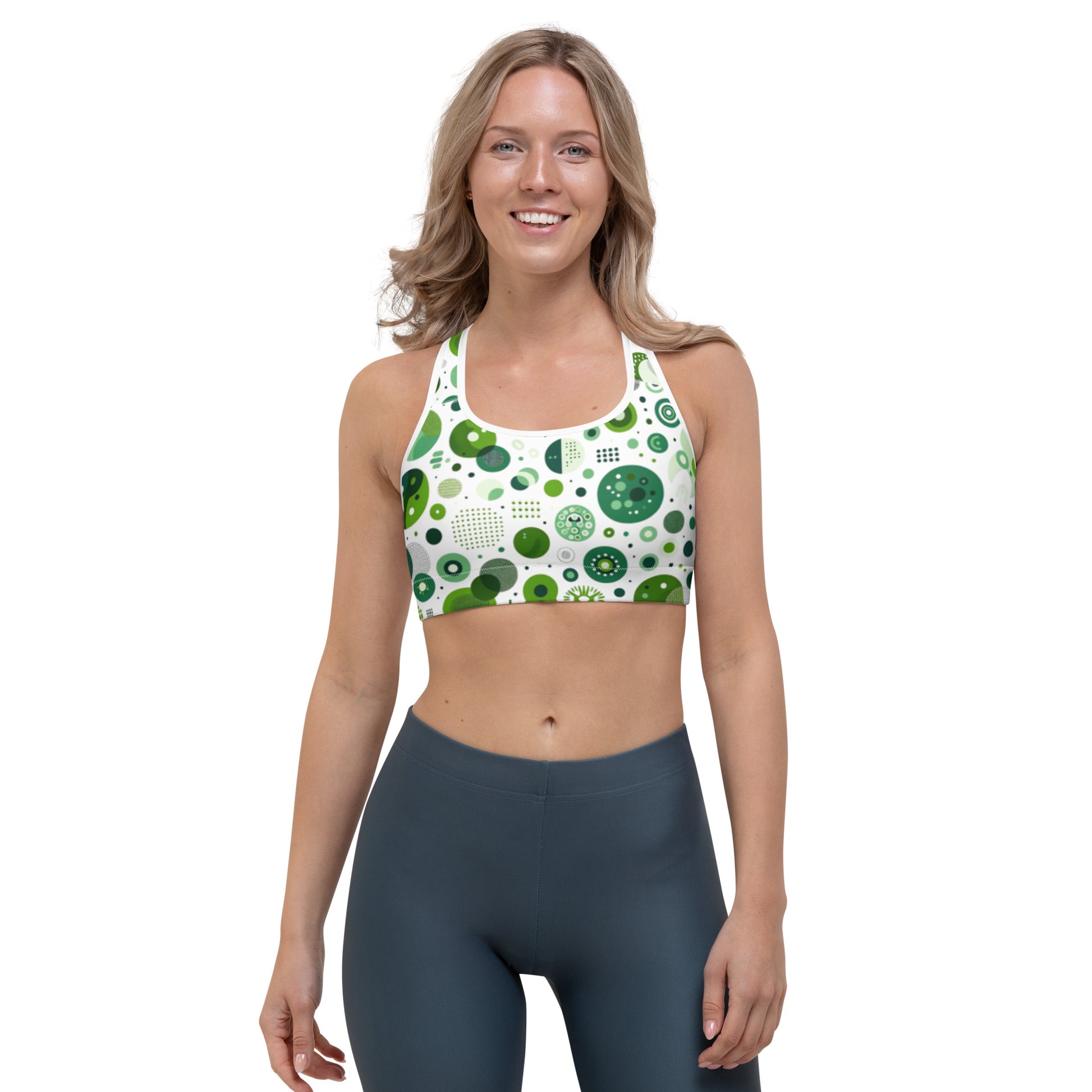 This gorgeous sports bra is made from moisture-wicking material that stays dry during low and medium intensity workouts. The bra has support material in the shoulder straps, double layer front, and a wide elastic band to ensure constant support.
